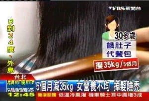 減肥過度小心變禿頭,台北一名30多歲女性 為了瘦身,每天不是餓肚子就是只吃代餐包,5個月內暴瘦35公斤,結果卻發現自己洗頭和梳頭時,頭髮都會一大撮、一大撮地掉,差點變禿頭,醫生提醒減重者 很容易因為營養攝取不均,變成休止期掉髮高危險群,3個月內減重超過10公斤,或是1天掉超過150根頭髮,都要特別注意。