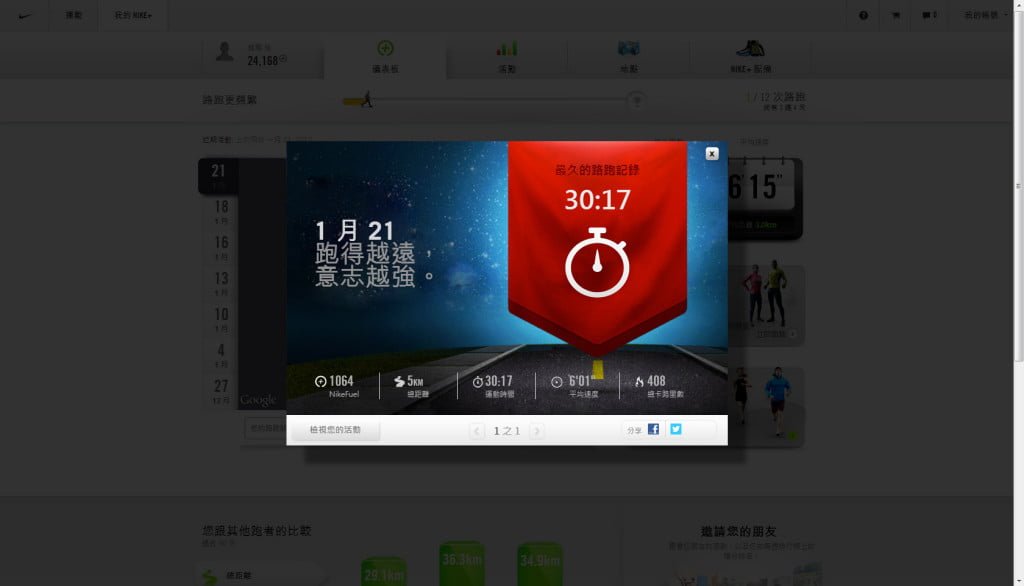 ▼如果你的手機有新紀錄的話,登入時也會給你一個超級大的紅色獎章,下面也有這次的相關訊息,也可以按分享按鈕,分享到Facebook/Twitter,這分享功能在手機也同樣可以做。