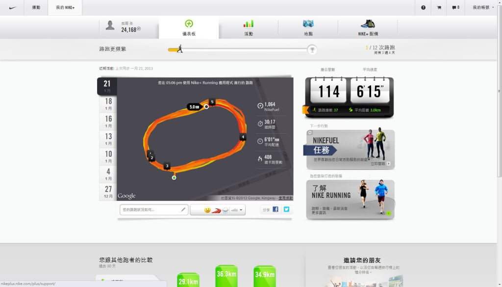▼關掉之後點進到儀表板,就可以看到你從之前的所有跑步紀錄,在網站上看會看到動態跑的情況,也就是那條線會從開始到結束衝刺,很刺激的感覺。