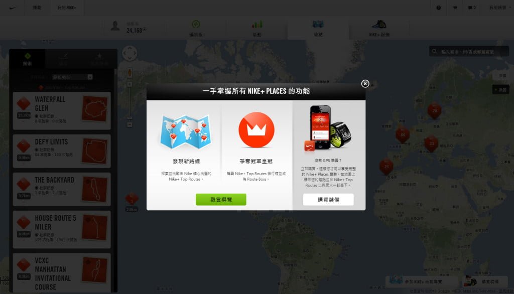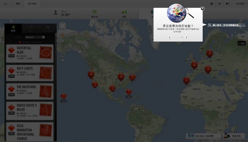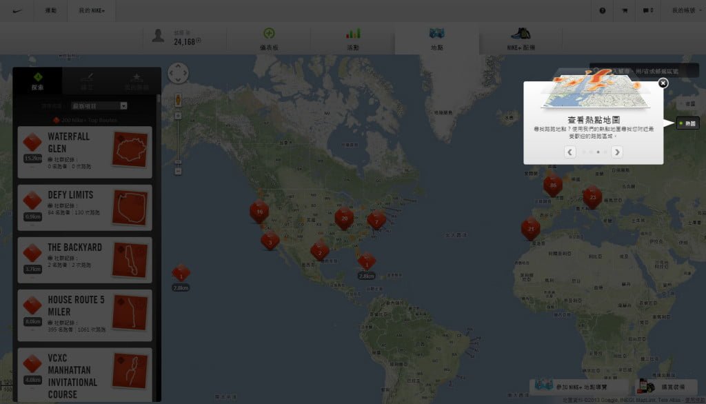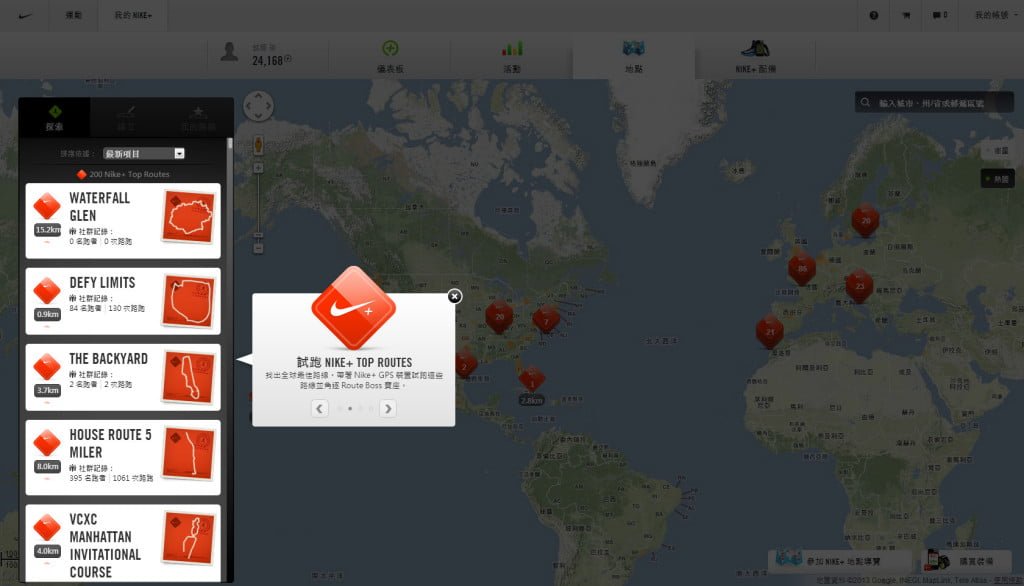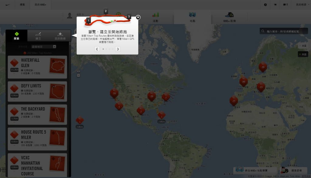 NIKE+運動訓練網站作者: 孫銘聰 / 2013-01-21 ▼然後按到地點,一開始就會進行導覽,教你如何使用。 ▼分別是左側功能欄位,包含瀏覽、建立與我的路線 ▼在探索頁簽中有已經內建許多的TOP ROUTES,號稱全球最佳路線。 ▼右側按鈕按下後可以看到全球用Nike+路跑的熱點地圖,可以用來尋找自己附近或你想看的城市的路跑狀況。 ▼當然也可以按搜尋去搜尋特定地點。 >>下一頁>>頁次: 1 2 3