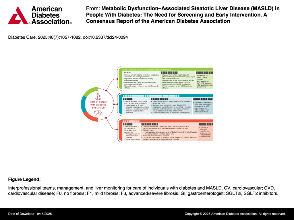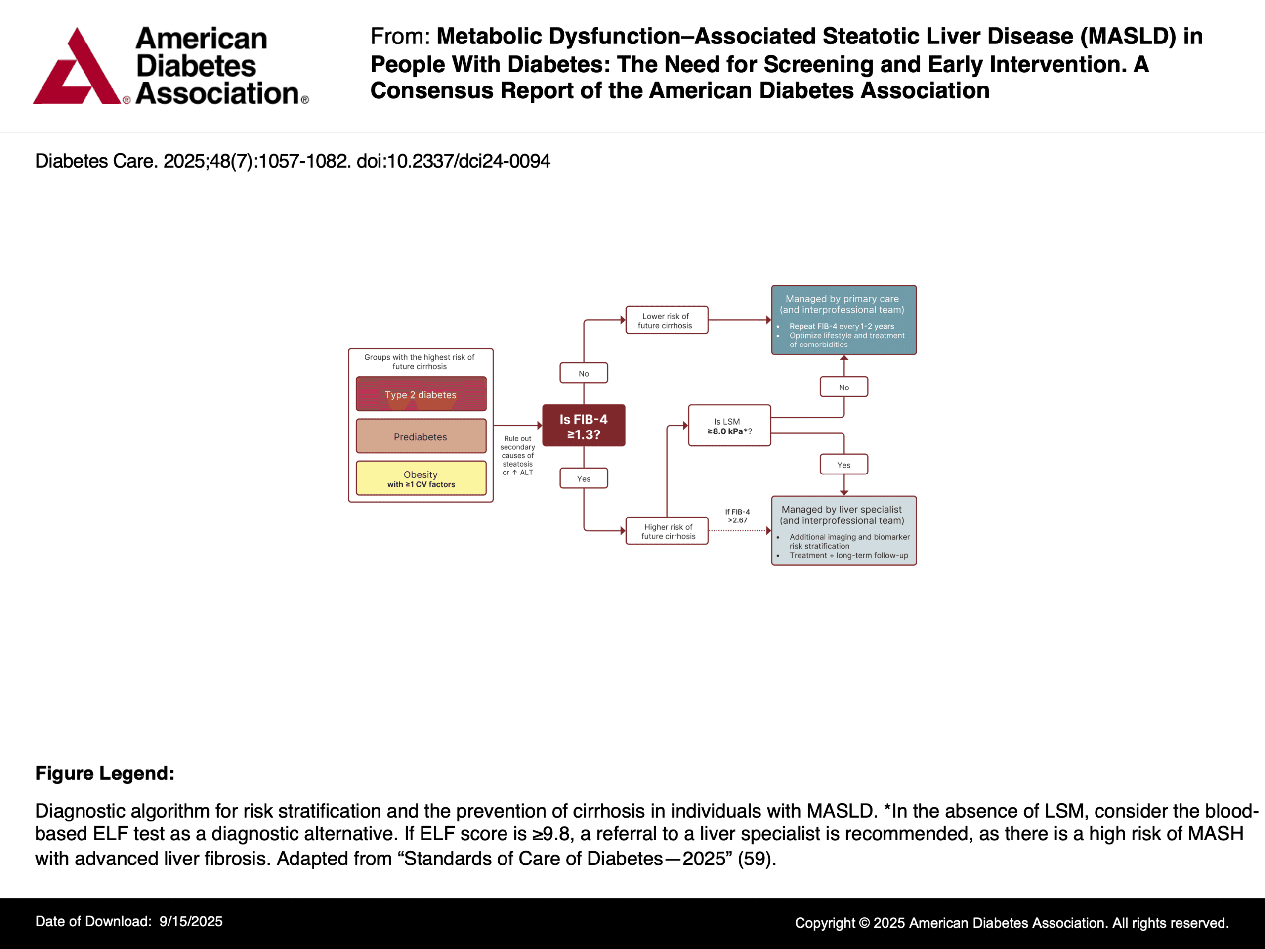 • 建議對具風險者進行肝纖維化的篩檢,以便早期干預。Diabetes Journals+1