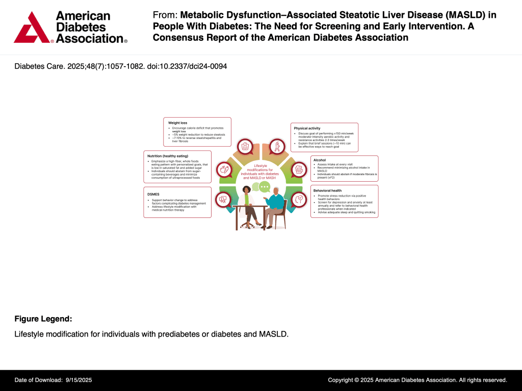 由於糖尿病與代謝功能障礙相關脂肪肝(MASLD) 的關連性越來越強,而脂肪肝已經成為慢性肝病主要的源頭,脂肪肝也使糖尿病機會增加,相關死亡風險也增加,從正常人、糖尿病前期就開始會影響,因此做糖尿病患者相關脂肪肝治療就變得越來越重要,也因此美國糖尿病學會新糖尿病指南針對篩檢與早期介入、健康減重建議的必要性,在糖尿病照護期刊(Diabetes Care)2025年5月28日 提出新的共識報告。以下簡單介紹: