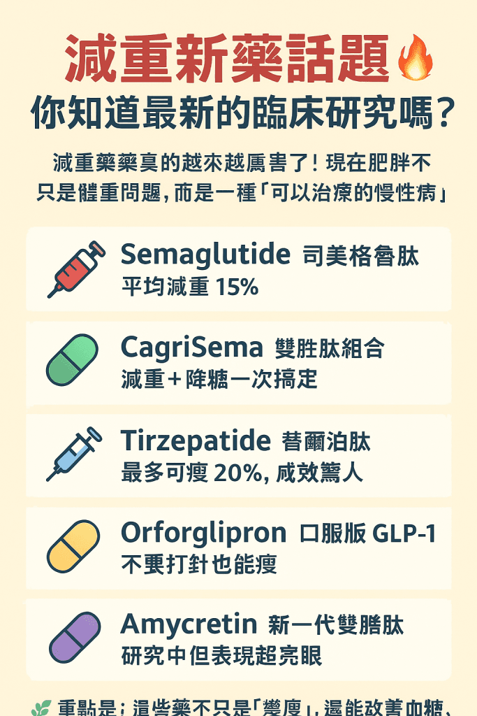 - 新一代藥物如 Tirzepatide、Orforglipron、Amycretin 皆展現強效減重潛力。