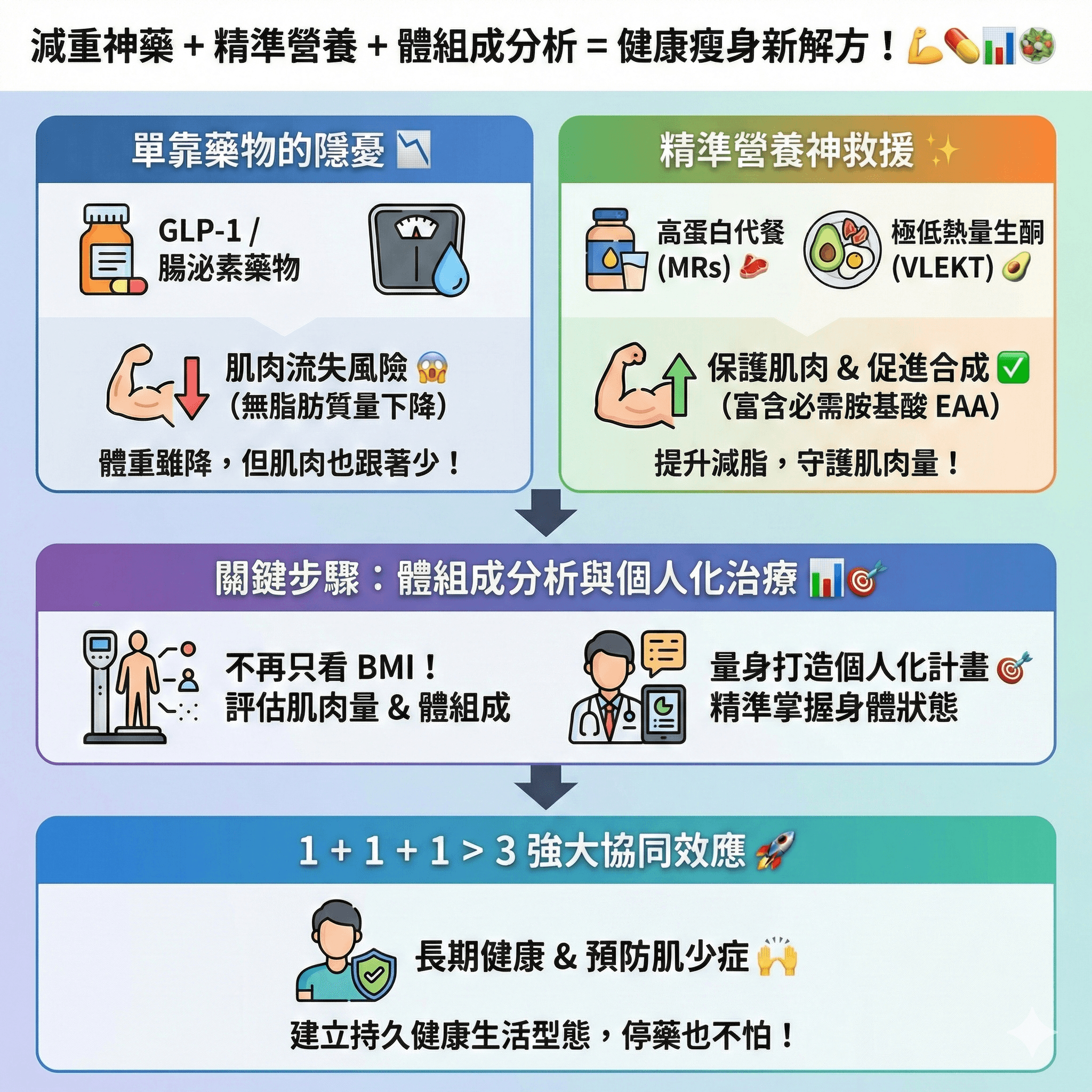 把「減重藥物」、「結構化營養計畫」跟「體組成分析與個人化治療計畫」結合在一起,可以產生強大的協同效應!藥物幫你控制食慾,而精準營養幫你提供對的養分並守護肌肉,透過體組成分析來看減重的效果與接下來的方向,擬定個人化治療計畫與目標,協同效應更棒!✨