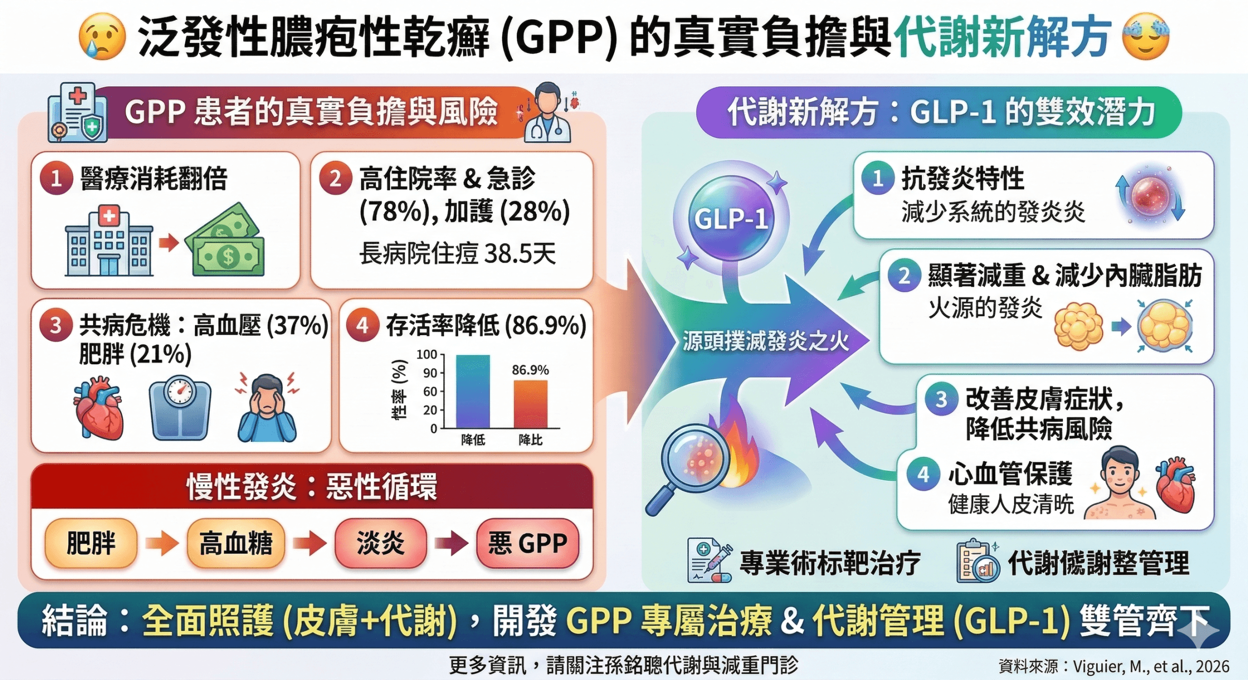 💔 共病危機:GPP患者伴隨極高的心血管與代謝共病,高血壓(37%)、肥胖(21%) 的發生率顯著高於一般人,且12個月存活率僅86.9%,明顯低於一般大眾。