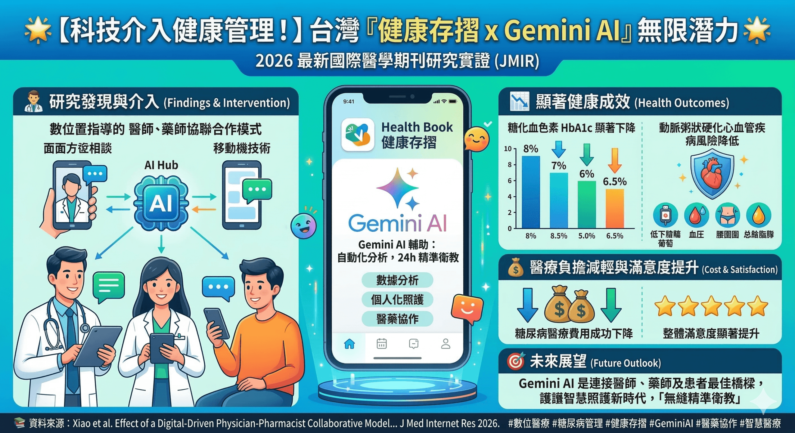 🎯 AI 與數位醫療的未來展望 研究結論指出,這種數位驅動的醫藥協作模式能改善第二型糖尿病管理的長期品質與效率,並有效降低醫療成本 。試想一下,如果研究中的數位通訊輔助,升級成健保署即將推動的「健康存摺 + Gemini AI」?🤔 未來 AI 將能自動化分析個人化數據、提供 24 小時精準衛教,成為醫師、藥師與患者之間的最佳橋樑,實現更無縫的智慧照護!讓我們一起期待更健康的未來吧!🚀