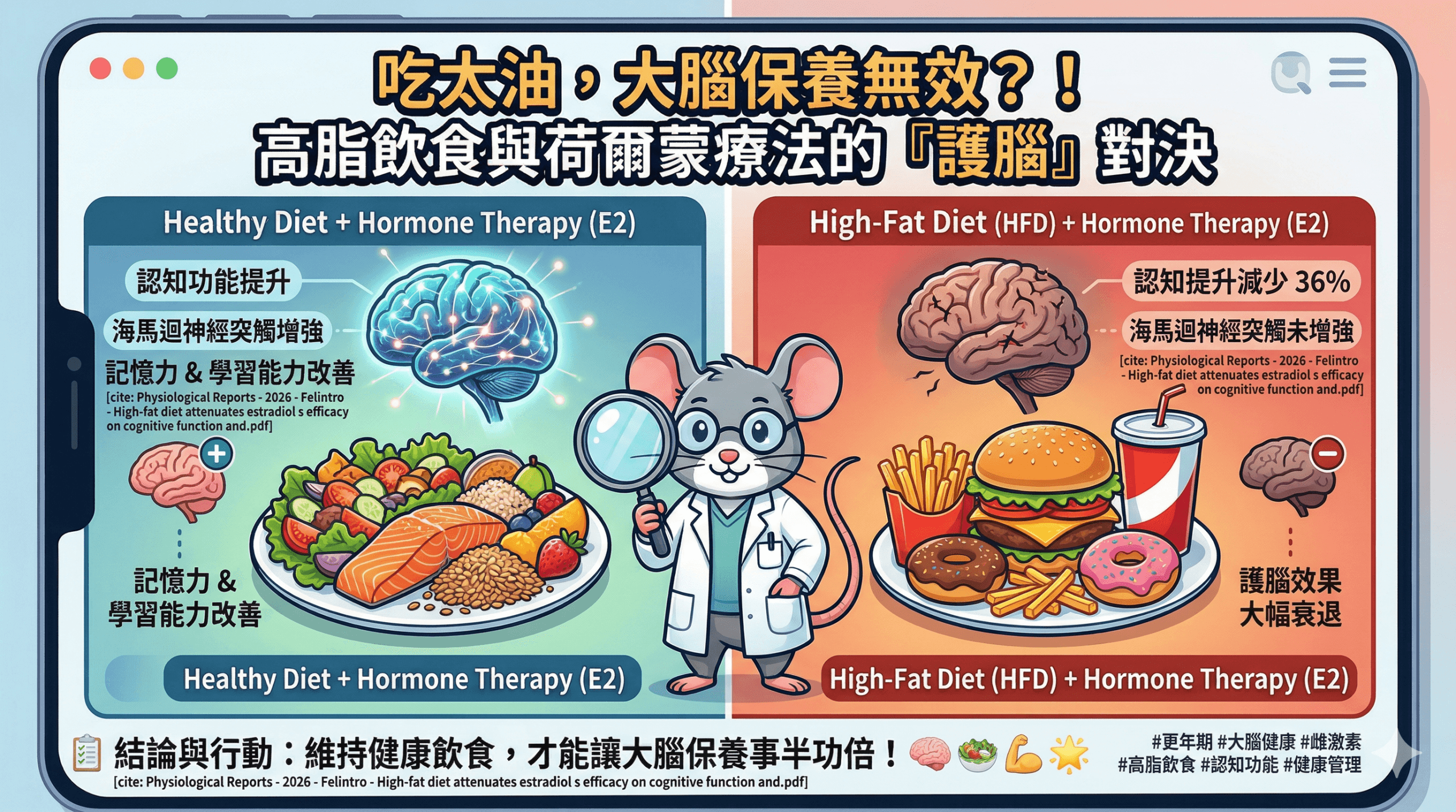 一篇於 2026 年發表在《Physiological Reports》的最新研究,針對中年且已切除卵巢的小鼠進行實驗,為我們揭示了「高脂飲食」是如何干擾雌激素的護腦功效!🐁✨