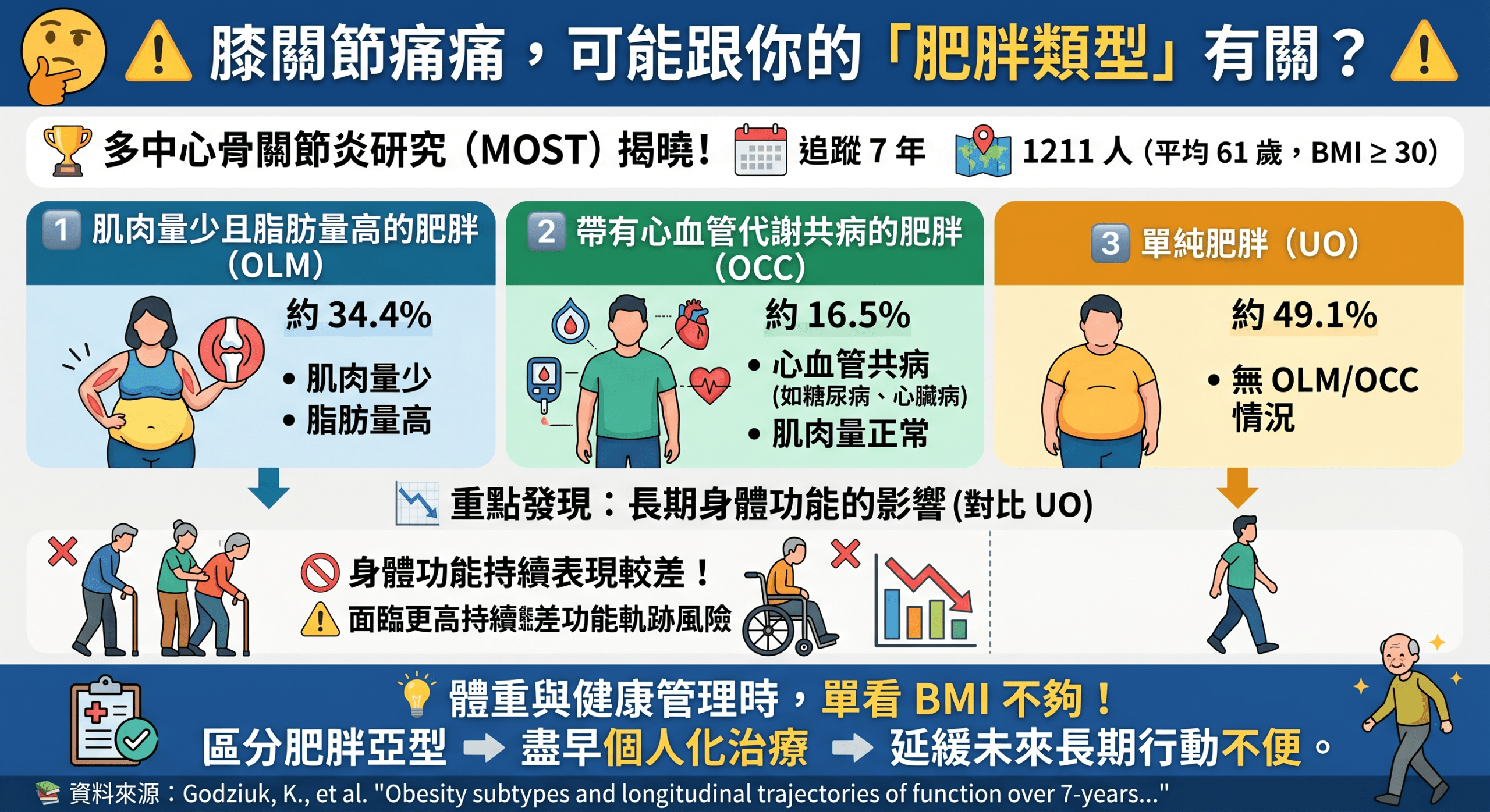 一篇來自「多中心骨關節炎研究(MOST)」長達7年的追蹤研究揭曉了答案。研究人員將肥胖分成三大類: 1️⃣ 肌肉量少且脂肪高的肥胖(OLM) 2️⃣ 伴隨心血管代謝共病的肥胖(OCC)(如糖尿病、心臟病等) 3️⃣ 單純肥胖(UO)(無上述兩種狀況)