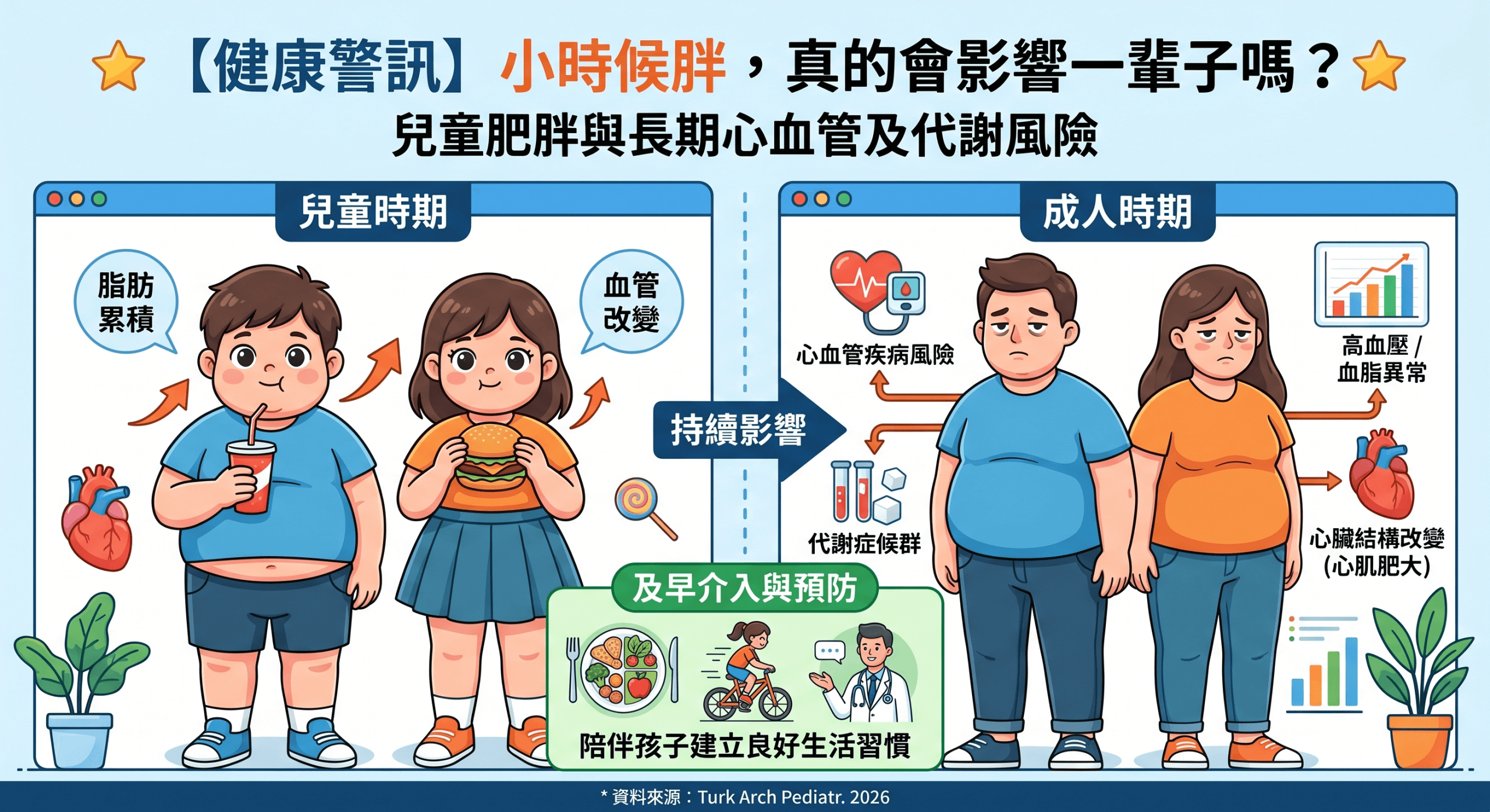 最新的醫學研究也證實了這個迫切性,以下整理出關於「兒童肥胖與長期心血管風險」的重點發現:👇