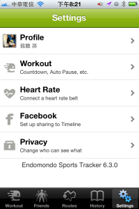 再來設定部分可以設定個人的身高、體重等,因為連結Facebook則剛剛設定個人檔案部分都填入了預設值,不過如果要比較準確的估算熱量消耗,還是要將生日、體重等調整過比較好,其他還有WORKOUT鍛鍊的細項調整、連結Heart rate monitors、鍛鍊完成要不要直接貼到Facebook與隱私設定,愛美的女生都不希望自己的體重被別人看到,這軟體預設也是只有自己看的到體重~