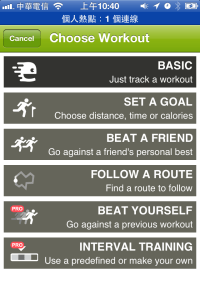 而WORKOUT部分則可以選擇不同的鍛鍊模式,預設是基本模式、也可設定目標、打敗朋友、跟隨路徑、戰勝自己(PRO版)、階段訓練(PRO版)
