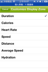 而按下DURATION、DISTANCE與HEART RATE等按鍵也可切換想顯示的項目,如果沒有Heart rate monitors就可以把那部分改成想要顯示的其他項目