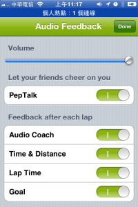 再來按下喇叭按鈕可以控制音量,可不可以讓朋友來激勵你,還有跑步當中的語音回饋提醒項目等